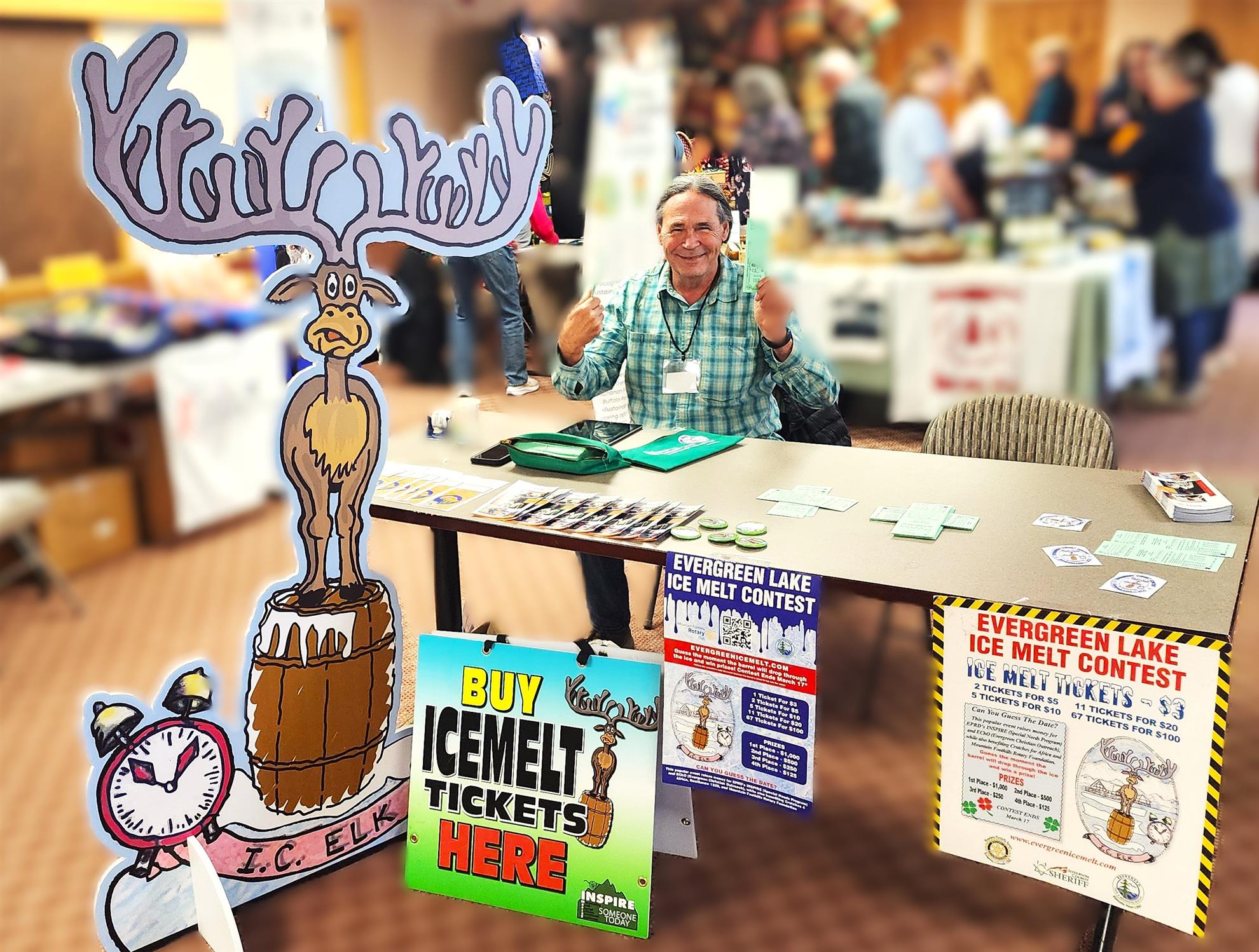Dennis all ready to sell Ice Melt tickets to happy Alternative Gift Fair attendees